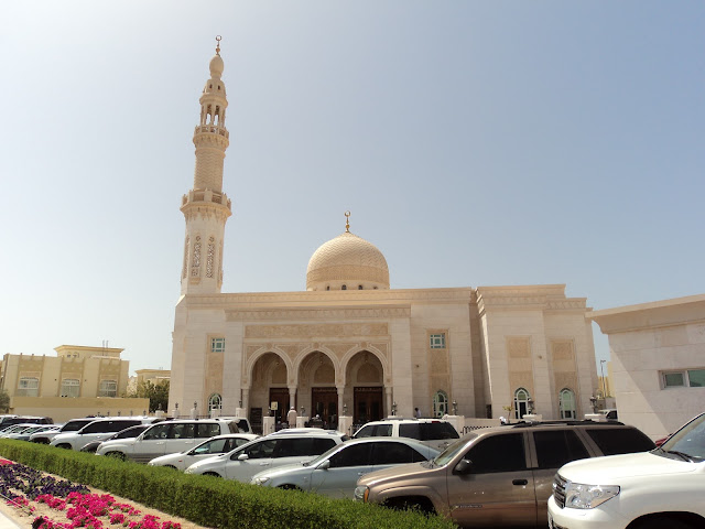 The parking lot of a mosque in downtown Dubai filled with cars at noon. 12:25 is time for prayer known as Dhuhr - between the declining of the sun and Asr (when the shadow of something is twice its real length).
